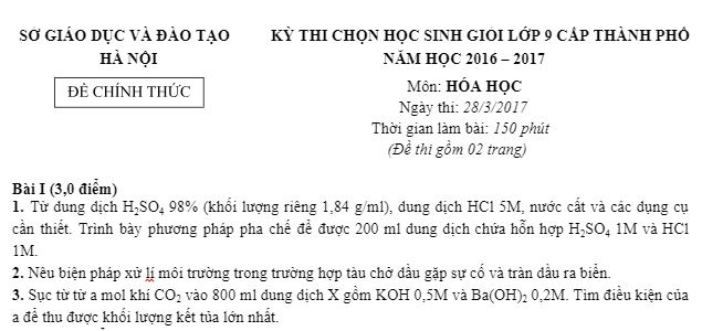 Hochoaonline.net xin giới thiệu với quý thầy cô và các em học sinh đề thi chọn học sinh giỏi cấp thành phố môn Hóa học lớp 9 của Sở Giáo dục và Đào tạo thành phố Hà Nội năm học 2016 - 2017: